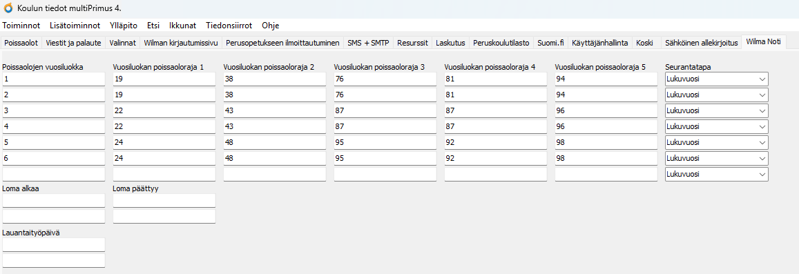 - Täytä Vuosiluokan poissaoloraja 1-5 -kenttiin halutut poissaolorajat tunteina (esim. 19).