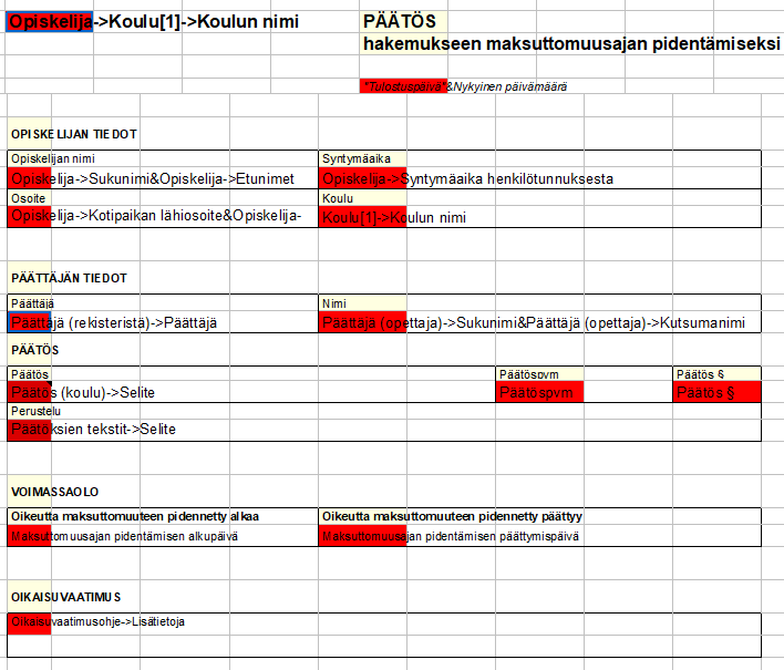 Ylätunnisteeseen tulostuu opiskelijan koulun nimi, asiakirjan nimi tekstinä (Päätös) ja tulostuspäivä Nykyinen päivämäärä-vakion avulla.