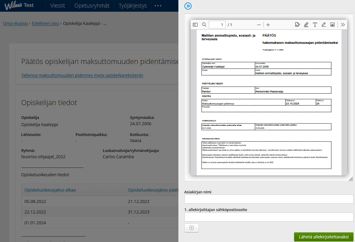 Päättäjä kirjautuu Wilmaan, valitsee tekemänsä maksuttomuuden pidentämisen päätöksen, jolloin avautuu päätöksen profiilisivu. Profiilisivun oikeassa yläkulmassa näkyy kohta Allekirjoituskutsu. Sitä klikkaamalla avautuu lista niistä tulosteista, joihin voidaan pyytää sähköinen allekirjoitus. Valitse listasta tämän ohjeen tulostemalli, jolloin se avautuu sivupaneeliin. Tarkista, että tiedot on oikein ja täytä tulosteen alapuolelle asiakirjan nimi ja sen henkilön sähköpostiosoite, joka allekirjoittaa päätöksen sähköisesti eli tässä tapauksessa päättäjä itse. Paina vielä Lähetä allekirjoitettavaksi -painiketta.