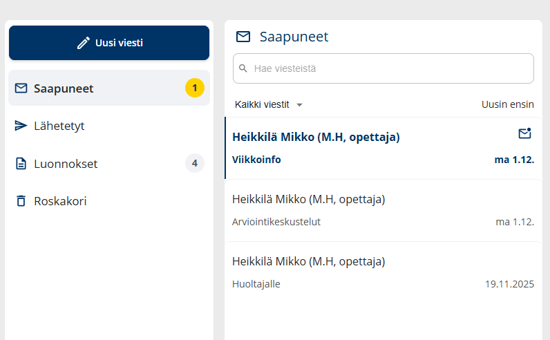 - Huoltajat voivat lähettää viestejä opettajille, omalle huollettavalleen sekä huollettavansa muille huoltajille.