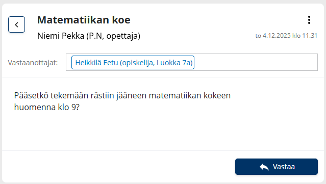 - Pikavastauksena lähetetty viesti ilmestyy alkuperäisen (tai mahdollisten muiden pikavastausten) alapuolelle. Viestiketju näkyy tämän jälkeen samanlaisena viestin alkuperäiselle lähettäjälle ja kaikille vastaaottajille. Pikavastausta käyttäen kaikki näkevät toistensa kommentit. Jos opettaja on lähettänyt viestin vaikkapa arviointiryhmälle MA2.1, näkevät ryhmän opiskelijat toistensa vastaukset. Jos opettaja ei ole sallinut vastaamista pikavastauksena, näkevät opiskelijat vain omat kahdenkeskiset keskustelunsa opettajan kanssa.