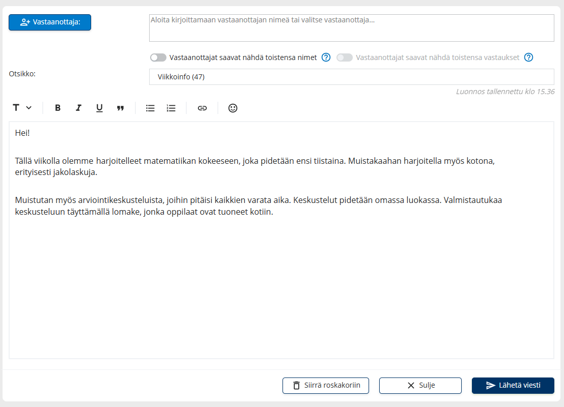 - Aina kun alat kirjoittaa uutta viestiä tai muokkaat luonnokseksi tallennettua viestiä, tallentuvat tekemäsi muutokset luonnokseen. Näin kirjoittamasi viesti pysyy aina tallessa, vaikka viestin kirjoittaminen keskeytyisi jostain syystä. Wilmassa näkyy "Luonnos tallennettu [kellonaika]" -ilmoitus merkkinä siitä, että muutokset viestiin on tallennettu.