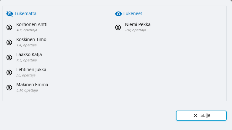 Opettajilla ja henkilökunnalla on mahdollisuus seurata sitä, kuinka moni vastaanottajista on lukenut viestin tai poistanut sen. Listan viestin lukeneista ja vielä tavoittamattomista vastaanottajista saa esiin Seuraa lukeneita -linkistä, joka näkyy lähetetyn viestin vastaanottajakentässä. Viestin lukeneet ja vielä tavoittamattomat vastaanottajat on eritelty käyttäjäryhmittäin.