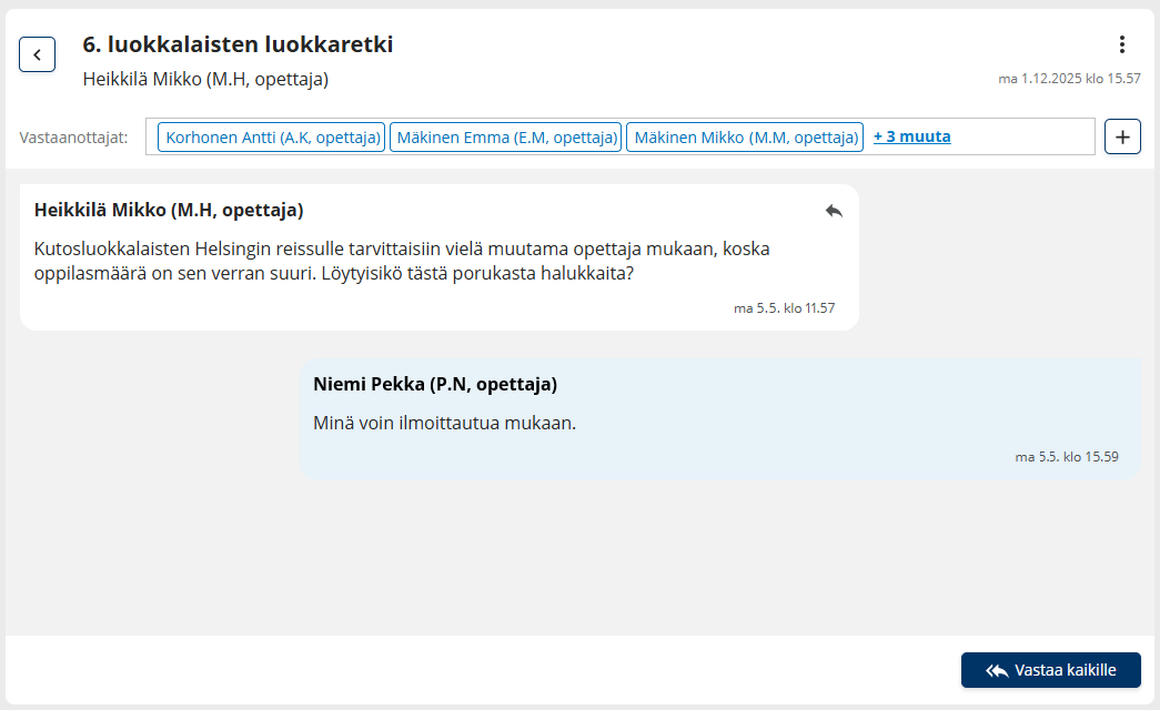 - Jos kyseessä on suuremmalle joukolle lähetetty viesti ja klikkaat viestin alta Vastaa kaikille -painiketta, lähtee vastausviestisi kaikille osallisille. Näet listan vastaanottajista viestikentän yläpuolella. Viereisen kuvan esimerkissä on tilanne, jossa yksi vastaanottaja on vastannut viestiin siten, että kaikki vastaanottajat näkevät vastauksen.