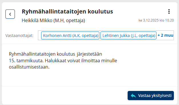 Saamasi viesti voi olla yksityinen eli vain sinulle lähetetty, tai se on voitu lähettää suuremalle joukolle. Vastaanottajajoukko näkyy viestin yläosassa.