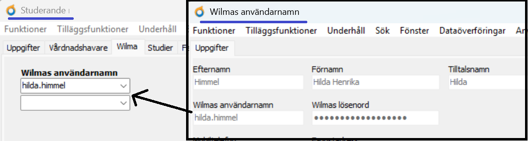 - Det nya användarkortet som uppstått i Wilmas användarnamn-registret kopplas automatiskt till studerandens kort, i fältet Wilmas användarnamn.
