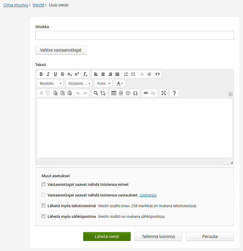 Otsikko kirjoitetaan Otsikko-kenttään ja varsinainen viestisisältö muotoilupainikkeiden alapuolella olevaan tekstikenttään.