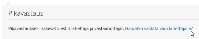 Jos haluat vastata vain viestin lähettäjälle, valitse ikkunan oikeasta ylälaidasta Viestitoiminnot / Vastaa erillisenä viestinä lähettäjälle -linkkiä tai Pikavastaus-ruudun vierestä Haluatko vastata vain lähettäjälle -linkkiä. - Jos Pikavastaus-ruutua ei näy tai olet ainoa vastaanottaja, lähtee vastauksesi aina vain lähettäjälle. Vastaamaan pääsee kohdasta Viestitoiminnot / Vastaa viestin lähettäjälle