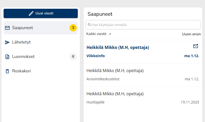 Tässä ohjeessa on ohjeistettuna Wilman perinteisen viestitoiminnon käyttö. Wilmaan tehtävä viestiuudistus tulee portaittain käyttöön eri oppilaitoksiin vuoden 2026 aikana, ja tämän vuoksi osa oppilaitoksista käyttää jo uutta viestitoimintoa ja osa perinteistä viestitoimintoa.