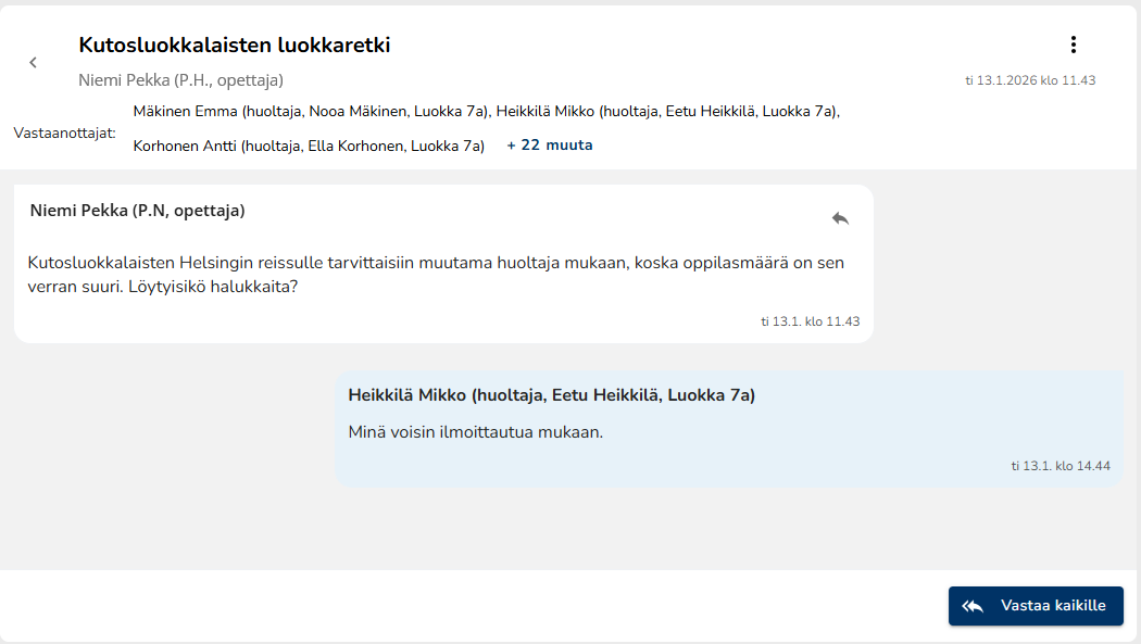 - Jos kyseessä on suuremmalle joukolle lähetetty viesti ja klikkaat viestin alta Vastaa kaikille -painiketta, lähtee vastausviestisi kaikille osallisille. Näet listan vastaanottajista viestikentän yläpuolella. Viereisen kuvan esimerkissä on tilanne, jossa yksi vastaanottaja on vastannut viestiin siten, että kaikki vastaanottajat näkevät vastauksen.