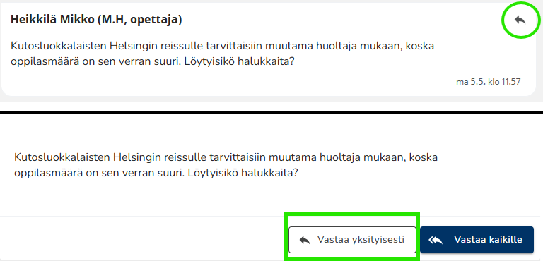 Kaikille lähetetty vastaus ilmestyy alkuperäisen viestin (tai mahdollisten muiden vastausviestien) alapuolelle. Kaikki näkevät toistensa kommentit. Jos siis opettaja on lähettänyt viestin vaikkapa tietylle ryhmälle, näkevät ryhmän opiskelijat toistensa vastaukset. Jos opettaja ei ole sallinut kaikille vastaamista, näkevät opiskelijat vain omat kahdenkeskiset keskustelunsa opettajan kanssa.