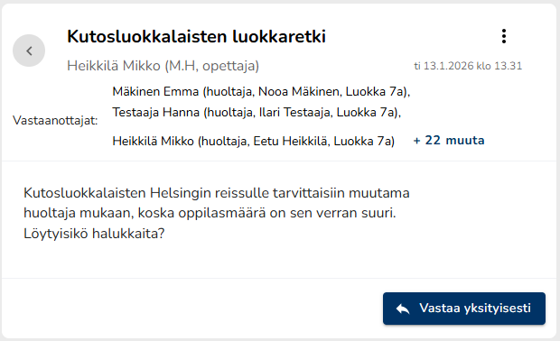 Viesti aukeaa viestiotsikkoa klikkaamalla. Jos kyseessä on usealle vastaanottajalle lähetetty viesti, johon on tullut jo vastauksia, näkyvät vastauksetkin alkuperäisen viestin alla.