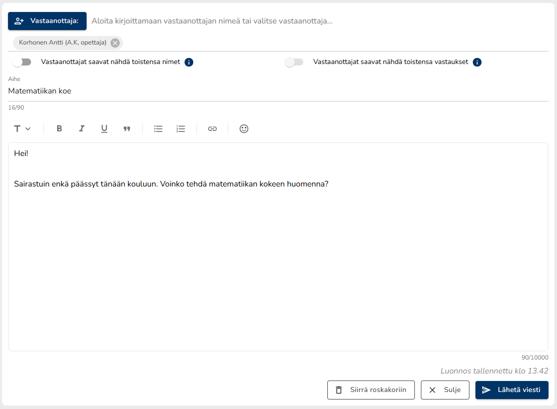 - Aina kun alat kirjoittaa uutta viestiä tai muokkaat luonnokseksi tallennettua viestiä, tallentuvat tekemäsi muutokset luonnokseen. Näin kirjoittamasi viesti pysyy aina tallessa, vaikka viestin kirjoittaminen keskeytyisi jostain syystä. Wilmassa näkyy "Luonnos tallennettu [kellonaika]" -ilmoitus merkkinä siitä, että muutokset viestiin on tallennettu.