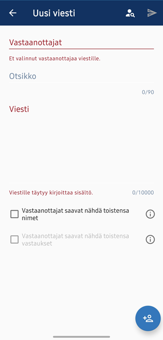 Otsikko ja viestisisältö kirjoitetaan suoraan tekstikenttiin, vastaanottaja valitaan Valitse vastaanottajat -painikkeella.