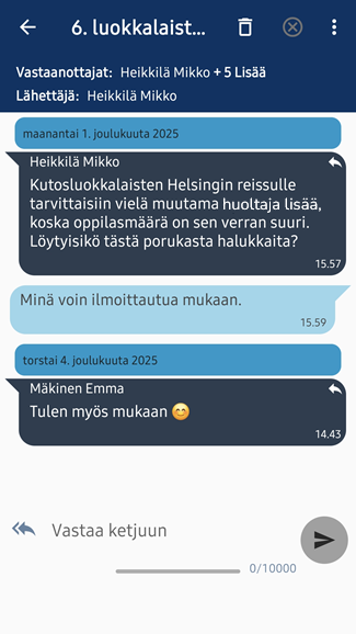Jos kyseessä on suuremmalle joukolle lähetetty viesti ja napautat viestin alta Vastaa ketjuun -painiketta, lähtee vastausviestisi kaikille osallisille. Näet listan vastaanottajista napauttamalla yläosasta Vastaanottajat-osiota.- Kaikille lähetetty vastaus ilmestyy alkuperäisen viestin (tai mahdollisten muiden vastausviestien) alapuolelle. Kaikki näkevät toistensa kommentit. Jos siis opettaja on lähettänyt viestin vaikkapa tietylle ryhmälle, näkevät ryhmän opiskelijat toistensa vastaukset. Jos opettaja ei ole sallinut kaikille vastaamista, näkevät opiskelijat vain omat kahdenkeskiset keskustelunsa opettajan kanssa.