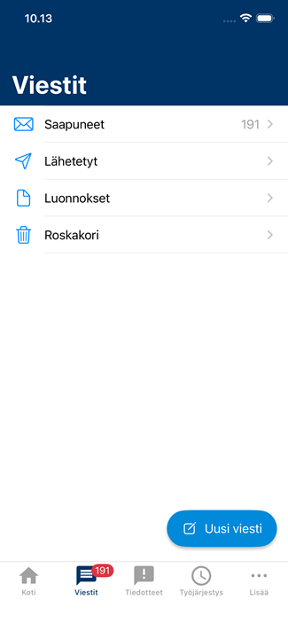Etusivun Viestit-osiossa näkyy 10 uusinta viestiä. Niiden perässä olevan Lisää-painikkeen tai valikon kautta voi siirtyä Viestit-sivulle, josta löytyy kaikki viestit. Kun sovelluksen päävalikon avaa, Viestit-otsikon perässä näkyy lukemattomien viestien määrä.
