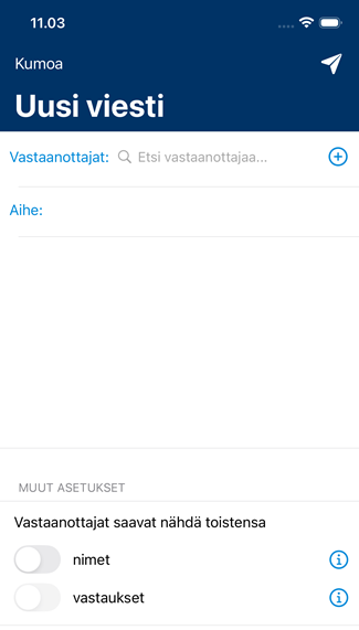 Jos olet lähettänyt viestin usealle vastaanottajalle ja asettanut päälle Vastaanottajat saavat nähdä toistensa nimet- ja Vastaanottajat saavat nähdä toistensa vastaukset -asetukset, voit lisätä viestiketjuun myöhemmin vielä uusia vastaanottajia. Vastaanottajan voi lisätä viestiketjuun napauttamalla Vastaanottajat-osiota ja alkamalla kirjoittaa vastaanottajan nimeä Hae -kenttään.