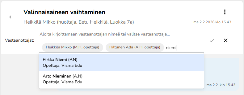 - Napauta Etsi vastaanottajaa... -tekstikenttää ja kirjoita vastaanottajan nimi tai osa siitä. Wilma suodattaa sopivia vaihtoehtoja sitä mukaa kun kirjoitat nimeä. Kun oikea vastaanottaja löytyy, voit valita sen listasta.