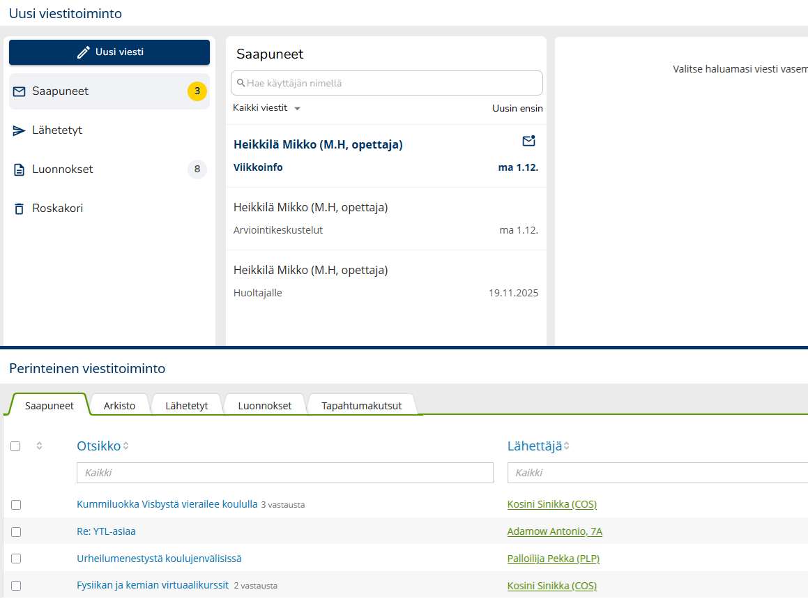 Tämä ohje on tarkoitettu Wilma-käyttäjille, joiden oppilaitoksen Wilmassa on käytössä perinteinen viestitoiminto. Valitse näytettävä ohje sen mukaan, kumpi oppilaitoksessasi on käytössä. Alla olevan kuvan avulla tunnistat helpoiten, onko omassa Wilmassasi käytössä uusi vai perinteinen viestitoiminto, sillä niiden ulkoasu poikkeaa paljon toisistaan.