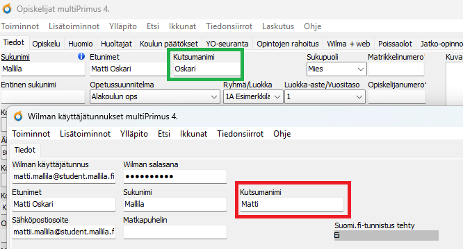 Koulukohtaiset Primus-käyttäjät, joilla ei ole pääsyä Wilman käyttäjätunnukset -rekisteriin, voivat päivittää Wilma-käyttäjien nimitietoja käyttäjätunnuskortille roolirekisterin (esim. Opiskelijat-rekisteri) kautta. Jokaisesta roolirekisteristä löytyy Lisätoiminnot-valikosta Päivitä Wilman käyttäjätunnuksia -toiminto, jolla tietoja voi päivittää. Toiminto on tarkoitettu tilanteeseen, jossa Wilman käyttäjätunnukset -rekisterissä on vanhentuneita/vääriä nimitietoja jollain käyttäjätunnuskortilla (ks. viereisen esimerkkikuvan tilanne). Toiminnolla ei voi päivittää itse Wilma-tunnusta.