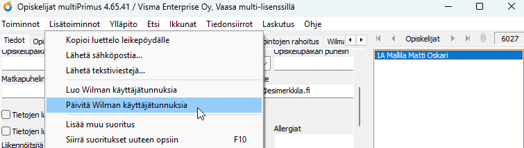 - Valitse ylävalikosta Lisätoiminnot / Päivitä Wilman käyttäjätunnuksia.