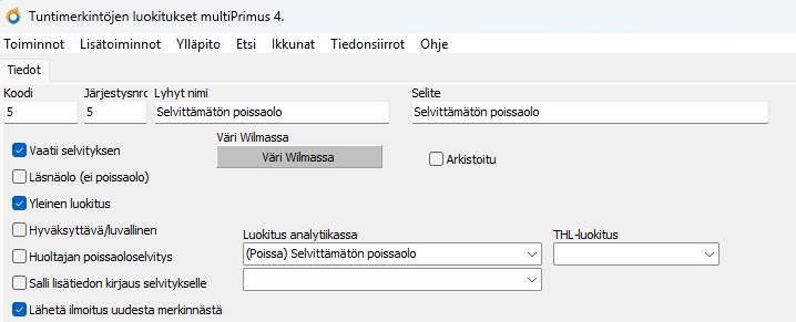 Wilma Noti huomioi poissaoloina kaikki ne tuntimerkinnät, joilla Läsnäolo (ei poissaolo) -kenttää ei ole rastittuna.