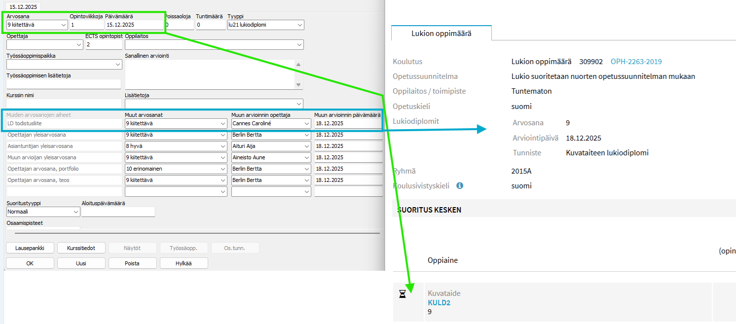 - Varsinainen arvosana siirtyy ops-puusta suoritusruudun Arvosana-kentästä ja suorituksen päiväys Päivämäärä-kentästä. Arviointi näkyy Koskessa muiden suoritusten joukossa joko diplomia vastaavan aineen alla tai erillisen lukiodiplomiaineen alla (riippuen siitä, miten ops on rakennettu).