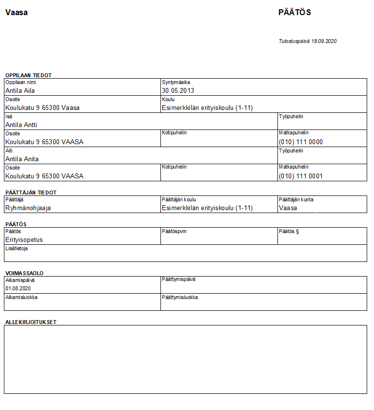 Tämä on mallituloste oppilaalle tehdyn päätöksen tulostamista varten.