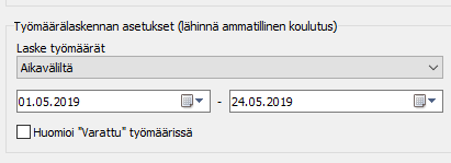 Kurren Yleiset asetukset -ikkunassa on osio Tunti- ja työmäärälaskennan asetukset, jossa voi määrittää, miltä ajalta opettajien työmäärät lasketaan. Vaihtoehtoina ovat "Jaksojärjestelmästä" tai "Aikaväliltä". Kun avaat Kurressa työsuunnitelmatulosteen, on tämän asetuksen mukainen valinta oletuksena käytössä.