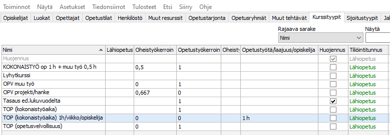 - Perustietoikkunan Kurssityypit -välilehti: Tun3. Täytä, jos kustannuslaskennassa halutaan eritellä tietyn kurssityypin tunnit, esim. näyttöjen ja työssäoppimisen.