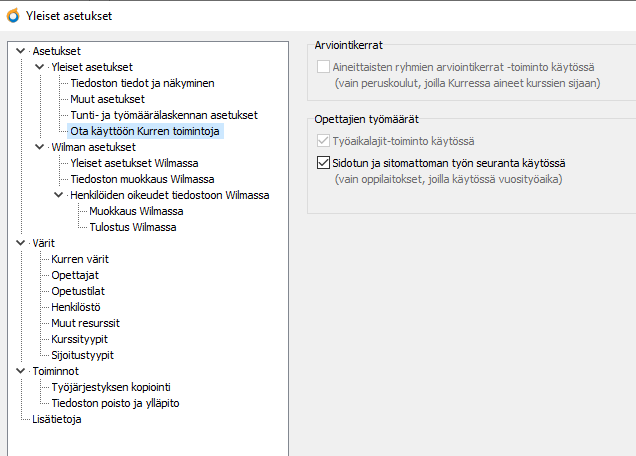 Kurre-tiedoston Yleiset asetukset -ikkunan Ota käyttöön Kurren toimintoja -haarassa on osio Opettajien työmäärät. Rastita sieltä kenttä Sidotun ja sitomattoman työn seuranta käytössä.