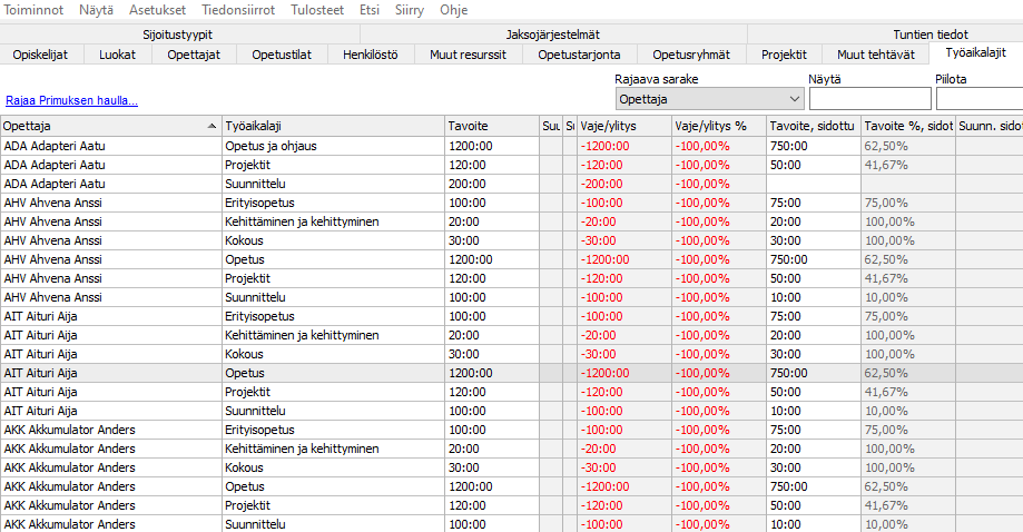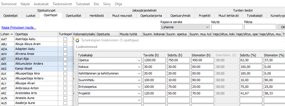 Opettajille voi lisätä myös yksittäin tai massana työaikalajeja syöttämättä niille tavoiteaikaa tai työn luonteen tuntimäärää. Opettajalle näihin työaikalajeihin merkityt työmäärät kasvattavat toteuman tunteja.