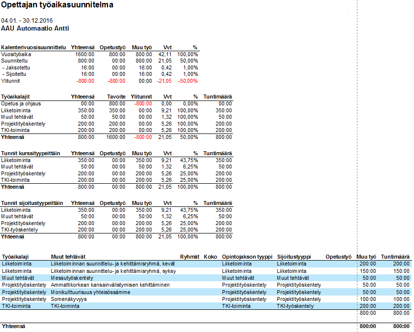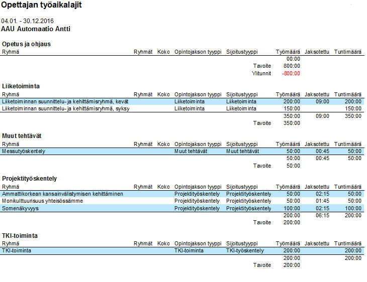Työaikalajit-kohdasta näkee eri työaikalajien kokonaistavoitetuntien määrän, ja onko tunteja vielä jäljellä tai onko niitä mennyt yli. Tulosteessa alimpana olevasta taulukosta näkee vielä tarkemmin, mitkä muut tehtävät liittyvät mihinkin työaikalajiin, ja miten niiden tuntimäärät ovat jakautuneet.