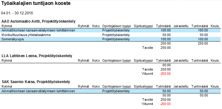 Valitse haluamasi rivi tai rivit Työaikalajit-välilehdellä ja valitse ylävalikosta Tulosteet / Työaikalajien kooste. Tämä tuloste on kooste kaikista valituista opettajista ja heidän työaikalajeistaan, niihin liittyvistä muista tehtävistä ja opetuksesta, sekä niiden tuntimääristä. Voit tarkastella esimerkiksi kolmen eri opettajan samaan työaikalajiin liittyviä tuntimääriä. Esimerkkikuvassa on kooste työaikalajista "Projektityöskentely". Kahdelle opettajalle on määritelty projektityöskentelyyn liittyviä muita tehtäviä, yhdelle on määritelty vain tavoitetuntimäärä työaikalajille.