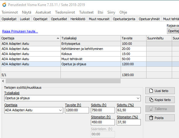a) Työaikalajit-välilehdellä luodaan opettajille tuntiresurssit työaikalajikohtaisesti. Kun opettajalle kertyy opetusta tai muuta työtä tiettyyn työaikalajiin liittyen, tuntimäärää verrataan täällä syötettyyn tavoitteeseen.