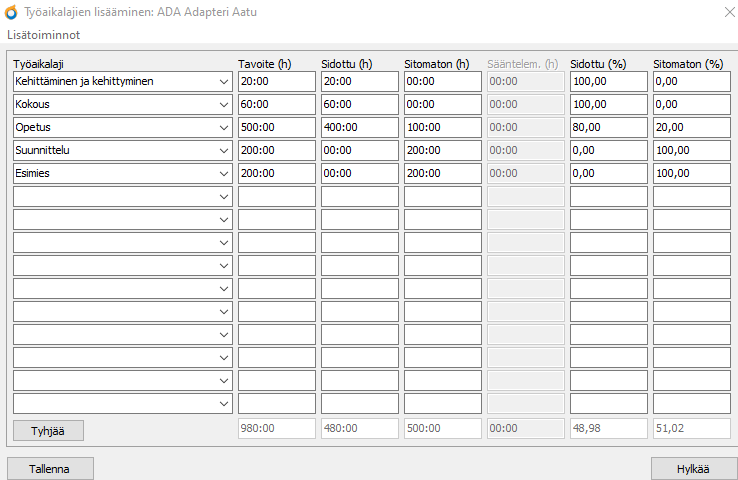 - Kun olet täyttänyt tarvittavat tiedot, paina Tallenna-painiketta. Täytä samalla tavalla yksittäiselle opettajalle tai kaikille opettajille tarvittavat työaikalajit tavoitetunteineen.