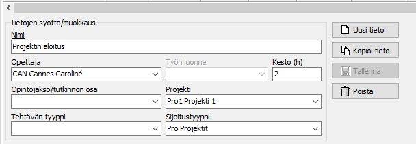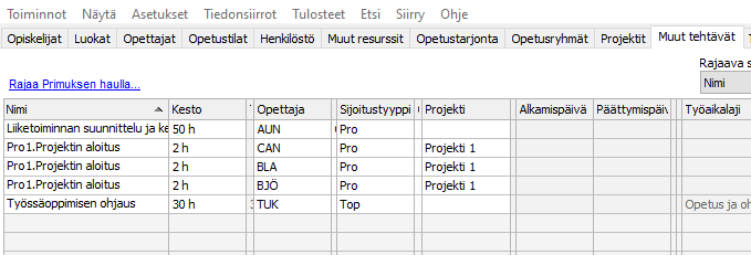 Avaa Muut tehtävät -välilehti ja klikkaa alhaalta Uusi tieto -painiketta. Täytä muulle tehtävälle nimi, oikea opettaja ja kesto. Tehtävän tyyppi viittaa kurssityyppiin, eli valitse tähän sellainen kurssityyppi, jolle on valittuna oikea työaikalaji. Toinen vaihtoehto on valita muulle tehtävälle sopiva sijoitustyyppi, jolle on määritelty oikea työaikalaji. Tallenna muu tehtävä klikkaamalla Tallenna-painiketta. Voit ottaa sarakkeen Työaikalaji näkyviin myös tällä välilehdellä, jolloin näet nopeasti tehtäväkohtaisesti, että sen tunnit kirjautuvat oikean työaikalajin alle. Kun lisäät opettajalle esimerkiksi työaikalajiin "Projektityöskentely" liittyvän muun tehtävän, sen kesto siirtyy työaikalajin suunniteltuihin tunteihin.