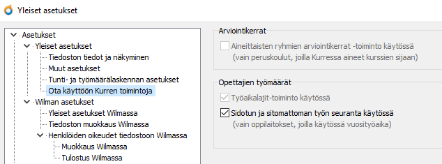 Työaikalajeja pystyy linkittämään opettajan työtehtäviin usealla välilehdellä Kurressa, mutta perustyö tehdään Työaikalajit-välilehdellä. Jotta työaikalajit saadaan Kurressa näkyviin, tulee ensin kurretiedoston Yleiset asetukset / Ota käyttöön Kurren toimintoja -kohdassa rastittaa Työaikalajit-toiminto käytössä. Vuosityöaikaa varten kannattaa samalla rastittaa myös Sidotun ja sitomattoman työn seuranta käytössä.