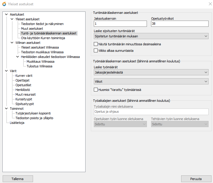- Kirjaa lisäksi yleisiin asetuksiin Tunti- ja työmäärälaskennan asetukset -haaran Työaikalajin nimi oletuksena -kenttään se työaikalaji, joka on käytössänne yleisin, esim. Opetus. Tämä tulee kaikille niille töille työaikalajiksi, joille ei erikseen valita mitään muuta. Oletustyöaikalaji voi olla joka Kurre-tiedostossa omansa.