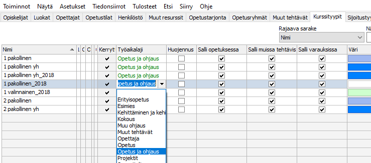 - Jos opetusryhmälle merkitään sekä kurssityyppi että sijoitustyyppi, sijoitustyypin työaikalaji yliajaa kurssityypin työaikalajin.