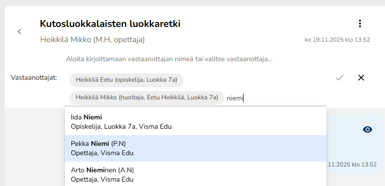 Vastaanottajat valitaan klikkaamalla Vastaanottaja-painiketta tai kirjoittamalla vastaanottajan nimen tai osan siitä vastaanottajakenttään. Wilma suodattaa sopivia vaihtoehtoja sitä mukaa kun kirjoitat nimeä. Kun oikea vastaanottaja löytyy, voit valita sen listasta.