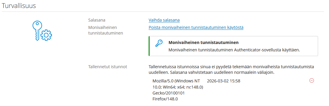 Jos rastit kirjautumisen yhteydessä Muista minut tällä laitteella -asetuksen, niin selain ei kysy käyttämälläsi laitteella tulevien kirjautumisten yhteydessä vahvistuskoodia, vaan pääset kirjautumaan pelkällä käyttäjätunnuksella ja salasanalla.