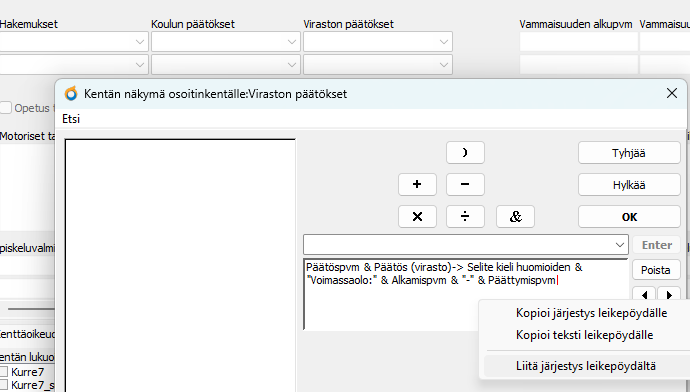 - Jos kentän näkymäksi on määritelty aiemmin joku muu, tyhjää se ensin. Klikkaa pikkuikkunan keskellä olevalla tyhjällä alueella hiiren kakkospainikkeella ja valitse Liitä järjestys leikepöydältä. Klikkaa vielä OK ja tallenna.