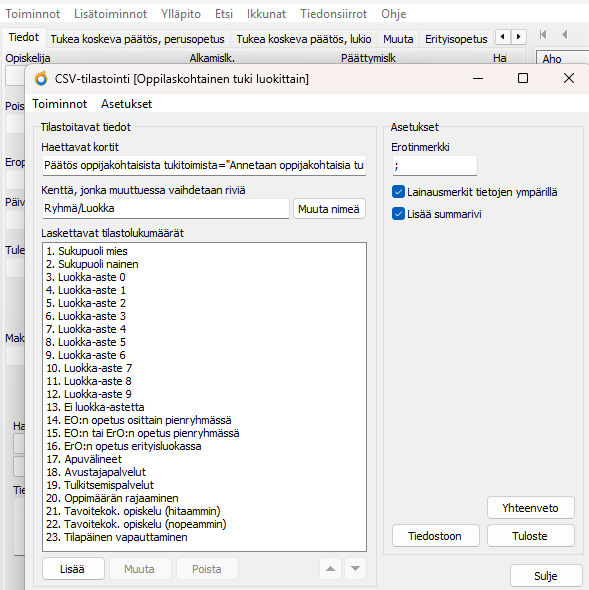 Tehdään sama haku Hakemukset ja päätökset -rekisteriin ja eritellään siellä csv-tilastoihin oppilaskohtaisten tukitoimien mukaan (6 rastikenttää), sukupuolittain, kouluittain , luokittain ja luokka-asteittain. Viedään tilastoon rivit myös rajaamisesta, tavoitekokonaisuuksittain opiskelusta ja tilapäisestä vapauttamisesta.