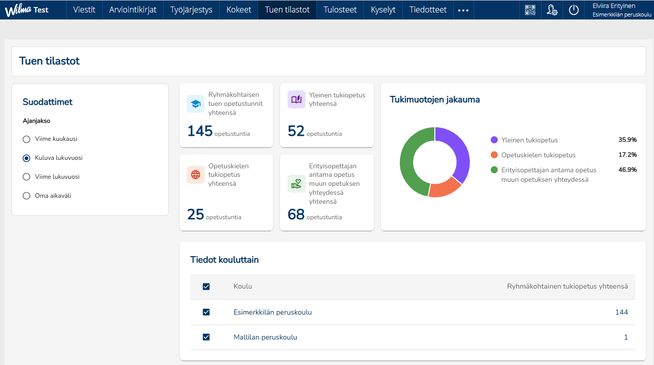 Vuoden 2026 alussa Wilmasta löytyy myös Tuen tilastot -välilehti, jossa esim. rehtori voi tarkastella kouluittain ja tietyillä aikaväleillä tehtyjä tuen merkintöjä. Tilastoa voi tarkastella myös koko kunnan tasolla (kaikki koulut). Välilehti näkyy henkilöille, joille on annettu erillinen käyttöoikeus. Tuen tilastot -välilehdellä näkyy aluksi vain perusopetuksen tilastot. Katso lisää alempaa ohjeesta.
