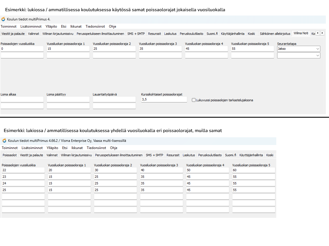 - Jos taas Poissaolojen vuosiluokka -kenttään on täytetty jokaiselle vuosiluokalle oma rivinsä, täytä vastaavasti Vuosiluokan poissaoloraja 1-5 -kenttään jokaiselle vuosiluokalle omat rajansa (ks. esimerkkikuvan alempi esimerkki).