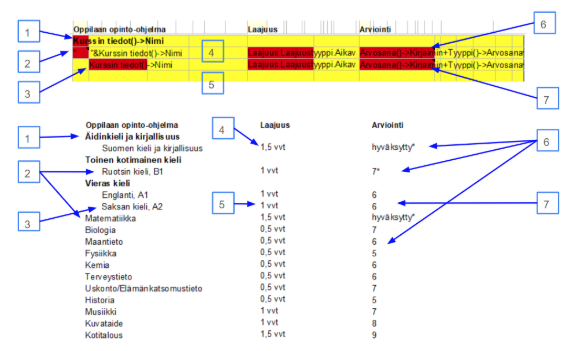 Todistuspohjan suoritustaulukko on tulostemallin keskellä oleva keltapohjainen taulukko. Taulukkoon tulostuu oppilaan opiskelemien aineiden nimet, laajuus kyseisellä vuosiluokalla ja arvosana.