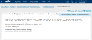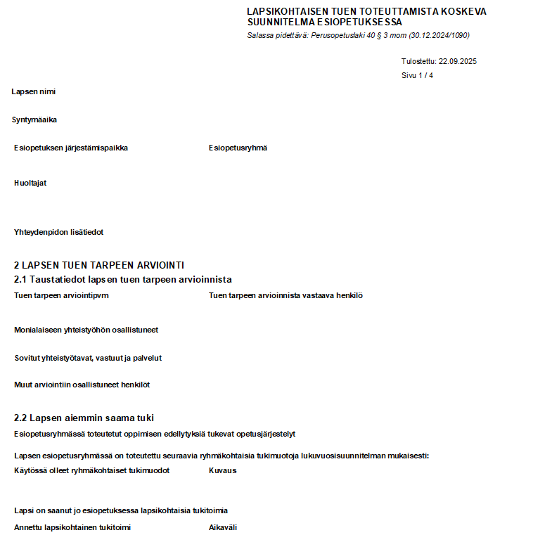 Tällä tulosteella voit tulostaa tuen uudistuksen (2025) mukaisen esiopetuksen tuen toteuttamista koskevan suunnitelman tiedot. Lomake, jolla tulosteen näyttämät tiedot kirjataan Wilmassa, löytyy täältä.