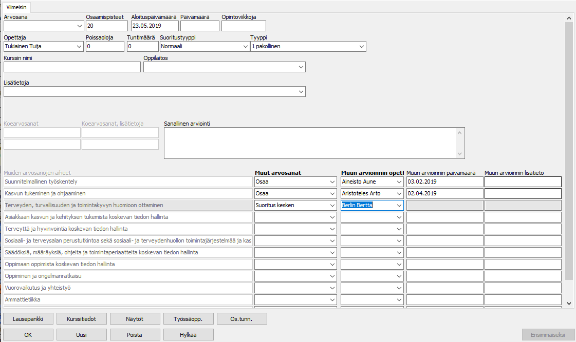 - Då du klickar på ändringsknappen (ikonen med tre blåa punkter) öppnas ett separat bearbetningsfönster där du kan spara övriga vitsord, lärare, datum och tilläggsuppgifter.