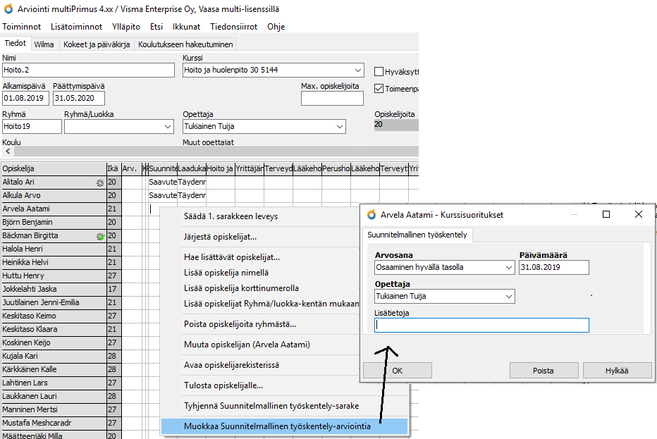 - Du kan göra ändringar genom att högerklicka på en kolumn och välja Ändra bedömningen .... Då öppnas ett hjälpfönster där du kan fylla i lärare, datum och tilläggsuppgift.